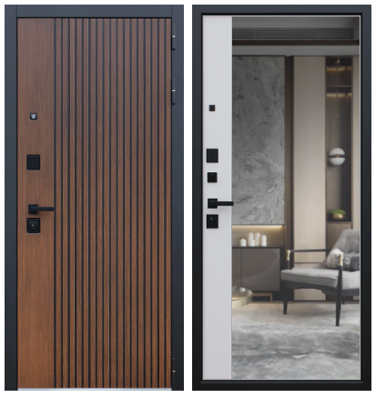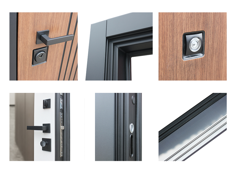 Лист металла 1,5 мм. Экошпонированная дизайнерская панель МДФ 10 мм. Линейная фрезеровка. Цветовая комбинация: "дуб кантри темный", черное патинирование по фрезеровке. Наличник МДФ гладкий 80 мм., цвет "черный кварц".