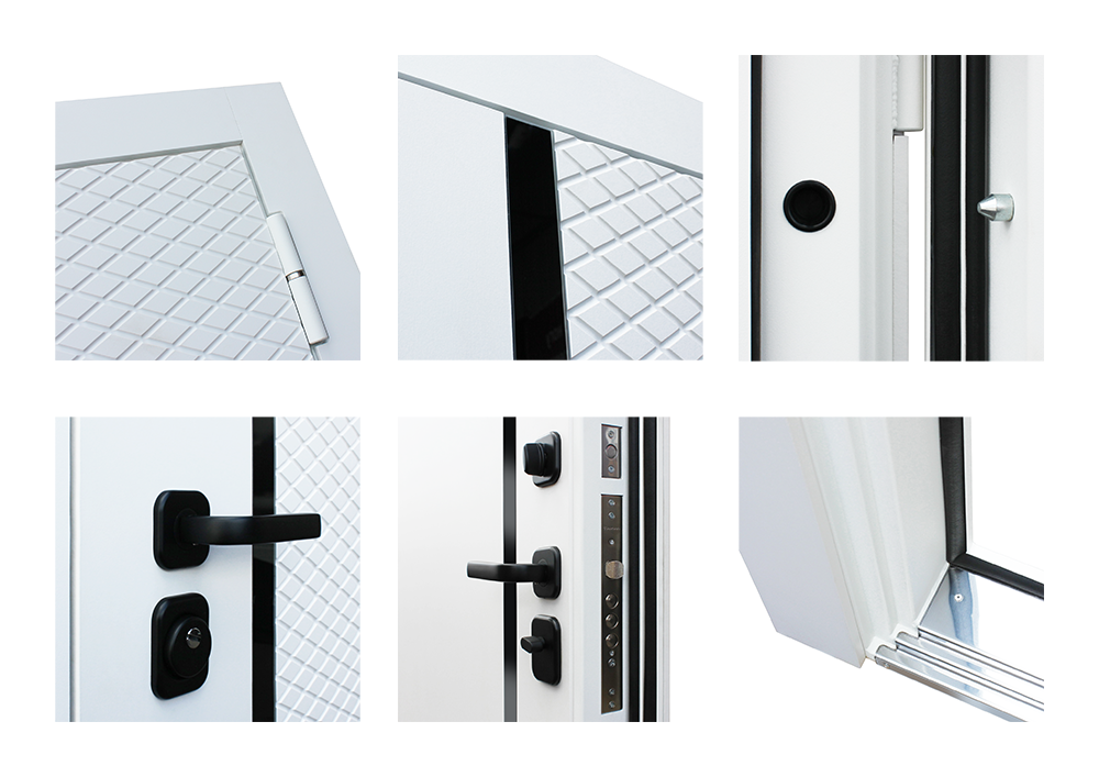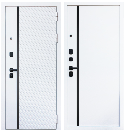 Лист металла 1,5 мм. Экошпонированная панель МДФ 10 мм (дизайн ФЛС). Цвет "белый матовый". Вертикальная вставка из черного глянцевого лакобеля. Объемная фрезеровка. Наличник гладкий, МДФ 80 мм.